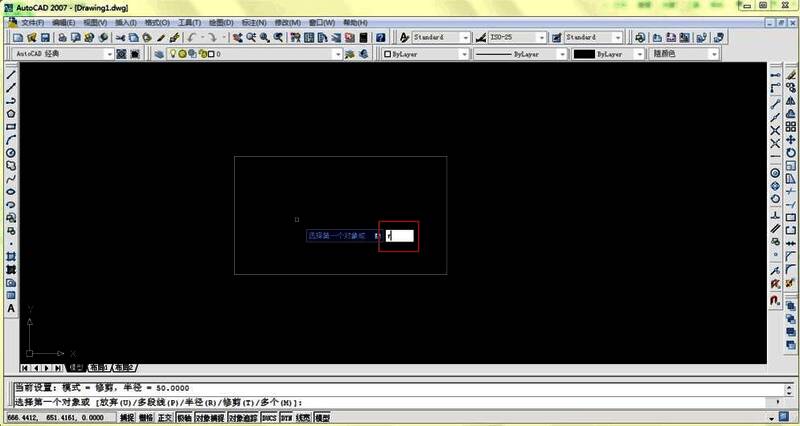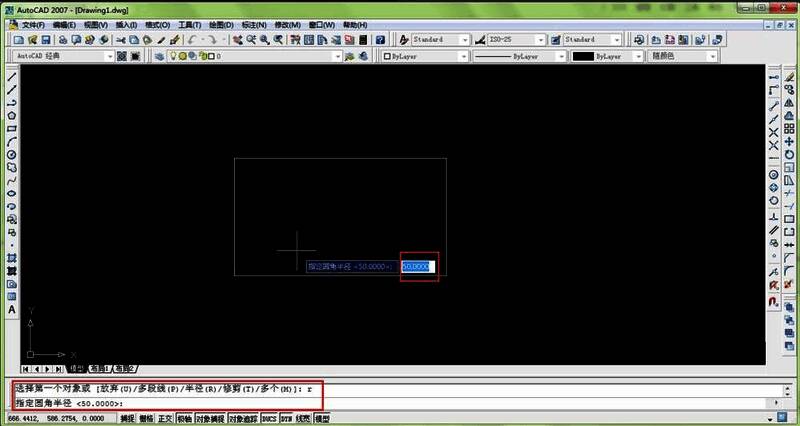 输入完毕后点击【Enter】按钮,此时下方命令栏弹出输入半径数值,这个半径数值是为了控制圆角大小的,比如我们输入50,如下图所示。