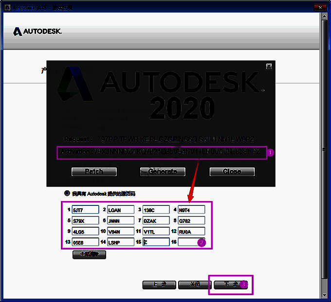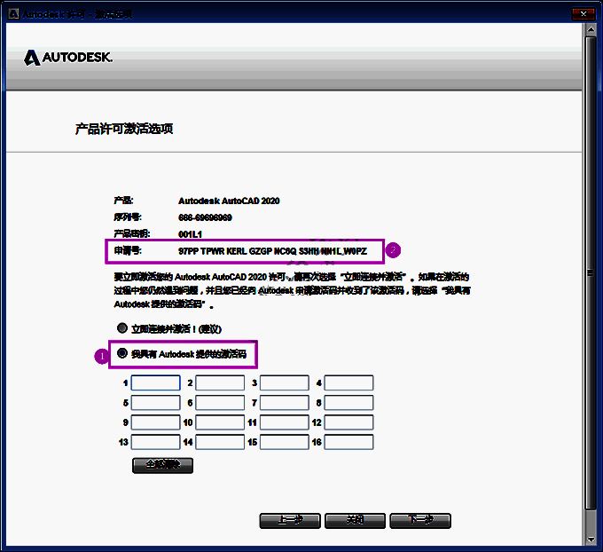12、获取到申请码后,复制到16位激活码框中。点击【下一步】。