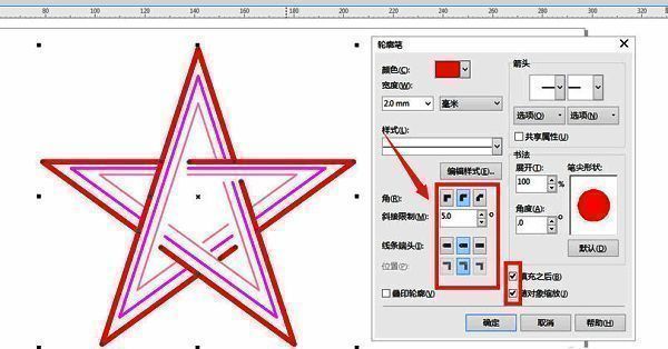 5.最后打开轮廓笔面板,为五角星填充不同颜色,点击确定保存设置即可