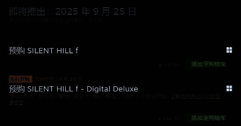 恐怖冒险游戏《寂静岭f》已开放预购。在Steam上,《寂静岭f》标准版售价391元,豪华版售价446元,游戏将于9月25日发售。