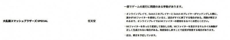 当Switch与Switch2玩家联机时,若任一方使用Mii斗士角色,比赛可能立即终止;Mii斗士的缩略图可能无法正确保存。