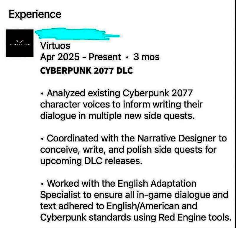传闻起源于Reddit用户“Free_Carpenter151”的发现,该用户在领英平台发现外包工作室维塔士某编剧的个人履历中,明确标注自2025年4月起参与“《赛博朋克2077》DLC”项目——该工作室正是负责游戏2.2版本更新的团队。项目描述提及“多个全新支线任务”与“即将发布的DLC内容”,暗示新扩展包正在开发中。