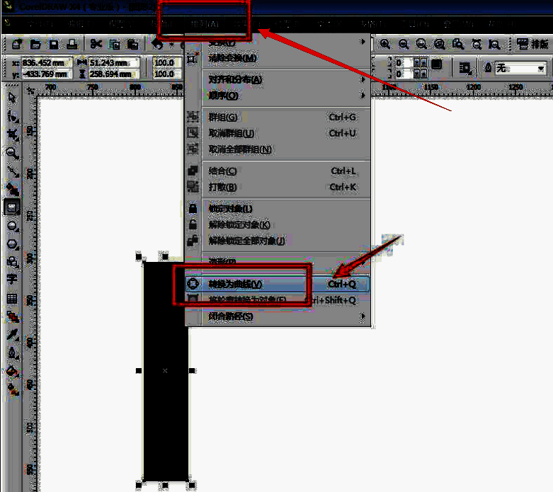 2.随后选中矩形,点击上方的排列菜单,选择转换为曲线按钮