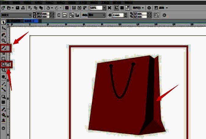 6.用两点线工具画出图形侧面,点击贝塞尔工具以及圆形工具绘制绳子以及绳孔,最后为手提袋去除描边并添加颜色填充即可