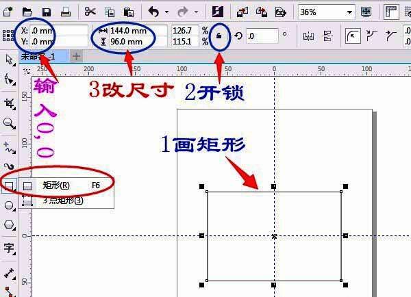 然后我们用“矩形”工具画矩形,属性栏中调整大小:144厘米×96厘米,位置:X:0,Y:0。如图设置: