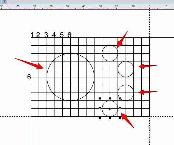 这时候在图纸6行和6列相交处用椭圆按Shift+Ctrl画出正圆和再画一个小圆,并复制多三个小圆。如图: