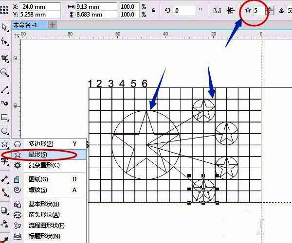 单击用“星形工具”按Shift+Ctrl在圆心处开始拖动画出五角星和小五角星如图:
