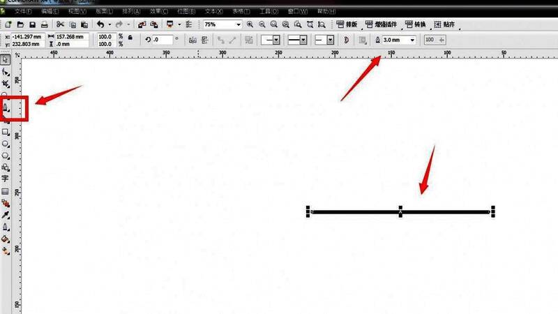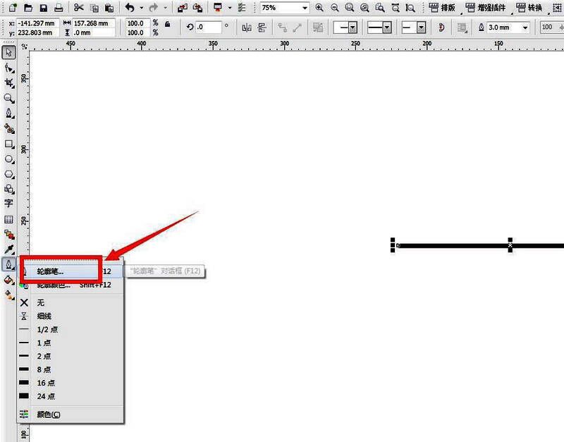 3、轮廓笔工具。点击工具栏中的轮廓笔工具,打开面板设置参数。