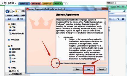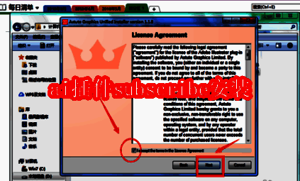 进入subscribe安装界面,点击【Next】按钮,确认电脑未打开ai,点击【Next】按钮,勾选【I accept……】前的选项框,再点击【Next】按钮,