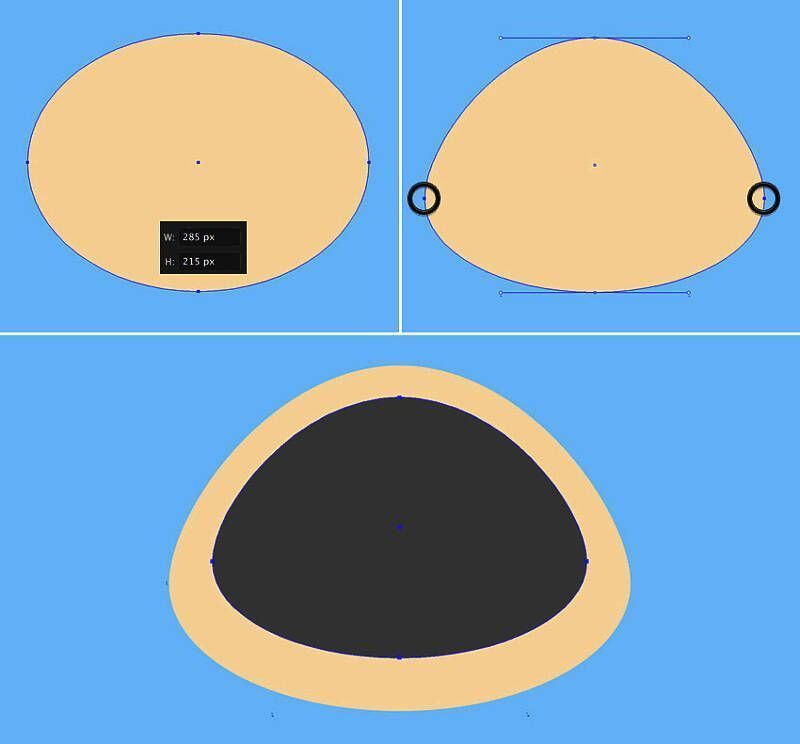 我们从头的基础开始。使用椭圆工具(L)制作一个285 x 215像素的浅米色椭圆形。 使用直接选择工具(A)选择其侧面锚点,并将它们向下拖动几个像素,使形状的底部稍微平坦一些。 您可以通过按住Shift键移动它们,或者用鼠标单击并拖动或使用键盘的向下箭头键。