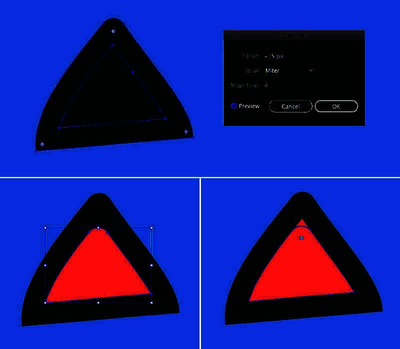 保持形状的选择,转到对象>路径>偏移路径,并将偏移值设置为-15像素,将所有其他选项设置为默认值。点击OK创建一个更小的三角形,并填充它为玫瑰粉色,从而创造耳朵的内部。