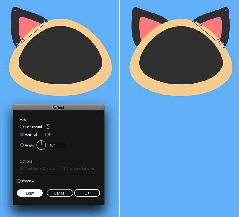 双击镜像工具(O) ,选择垂直轴,然后单击复制,创建耳朵的镜像副本。将其连接到头部的相对部分。