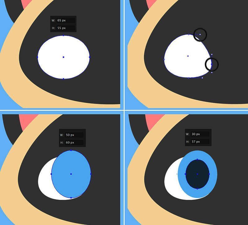 让我们继续画我们的人物。使用椭圆工具(L)制作一个65 x 55 像素的白色椭圆的眼球。 使用直接选择工具(A)缩短顶部锚点和右锚点顶部手柄的右手柄,使眼睛的右边缘更倾斜。