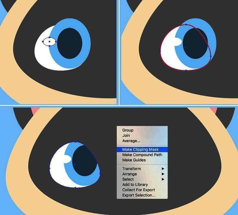 复制(Control-C)白眼球,粘贴在前面(Control-F)并置前(Shift-Control-])。 现在选择眼睛的所有元素,单击鼠标右键,然后选择建立剪切蒙版,从而将所有内容放置在顶部副本中,作为虚构容器。 此容器内的所有形状仍然可编辑。您可以在图层面板中找到剪辑组,展开它,然后移动,编辑和重新排列对象。