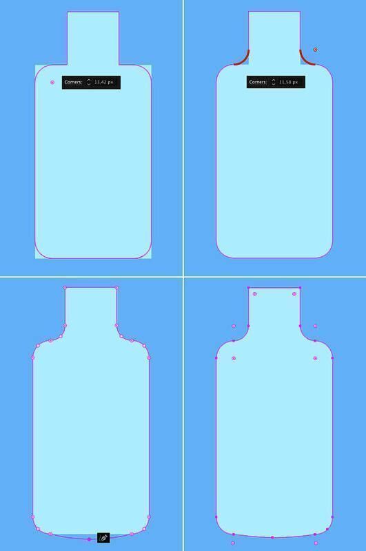 让我们用直接选择工具(A)选择瓶子的角落,并通过拉动活角的圆圈标记来让角变圆。 选择瓶身和瓶颈之间的内部角,并使其平滑。如果您喜欢圆形数字,您可以从顶部的控制面板调整角落半径。或者如果看起来不错,您可以将其保持原样。