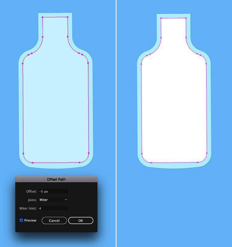 转到对象>路径>偏移路径,并将偏移值设置为-5 px,从而创建一个更小的内部轮廓。 用浅蓝色填充,使瓶子的玻璃边缘变厚。复制(Control-C> Control-F)新形状,并将副本填充白色的牛奶。