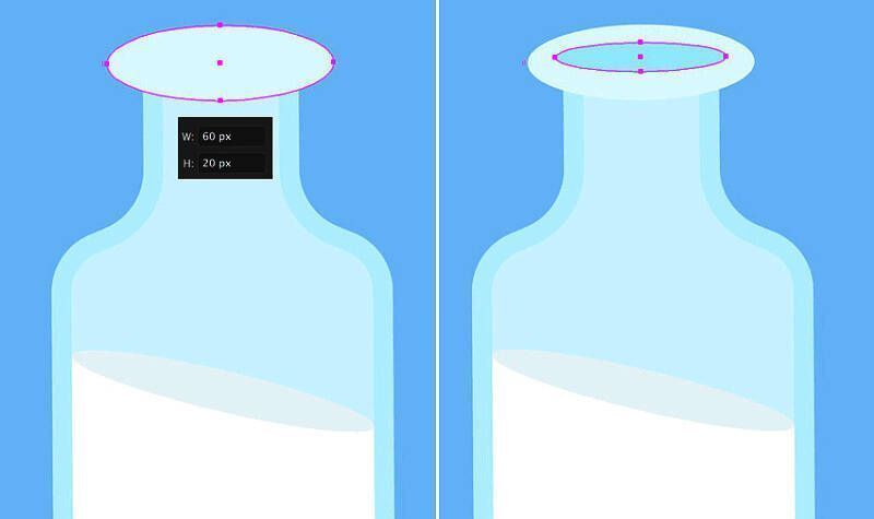 我们让瓶子半空!创建一个椭圆,旋转它,并调整大小,使其适合瓶子的内部。选择椭圆和牛奶形状。 现在抓住形状生成器工具(Shift-M),按住Alt键,一旦你看到鼠标光标旁边一个微小的减号,就将其悬停在牛奶形状的上半部分。 一旦它变成灰色,单击它,以删除这一块。太棒了!一半的牛奶消失了!