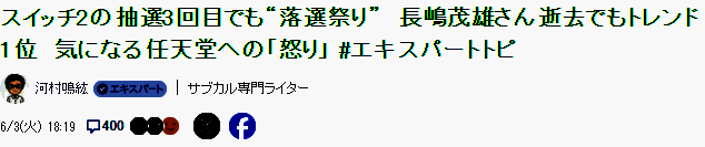 ·Switch 2马上发售,登顶X趋势榜第一名可以理解,那么中村悠一居然排在了第二位,并不是这位声优在工作上有多么出色而受到了异常热烈的关注,而是连续三轮参与抽选都没中。