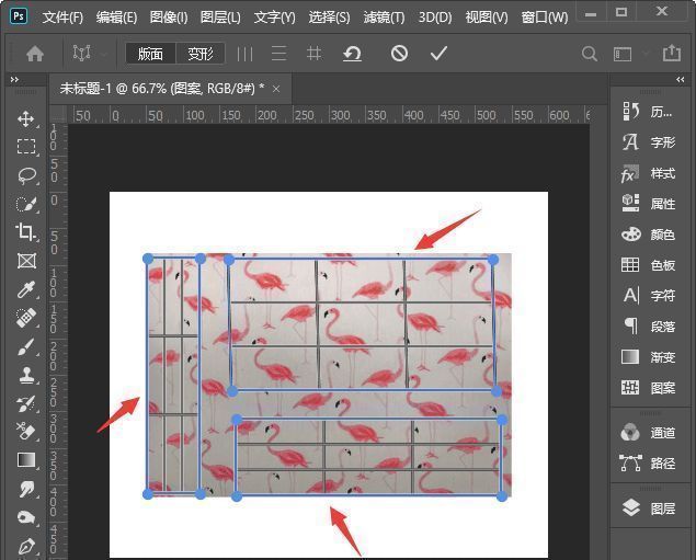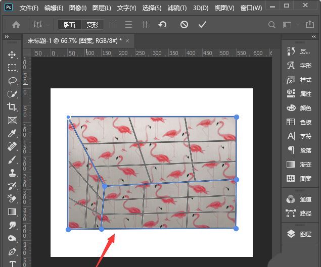 6、我们把不透明度调整为80%,点击【变形】调整好图案,如图所示。