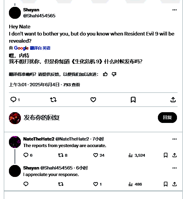 现在又一可靠爆料人 NateTheHate 声称,《生化危机》系列的下一款主线作品将在本周某个时间点公布。他在 Twitter 上回应说:“昨天的报道是准确的”。