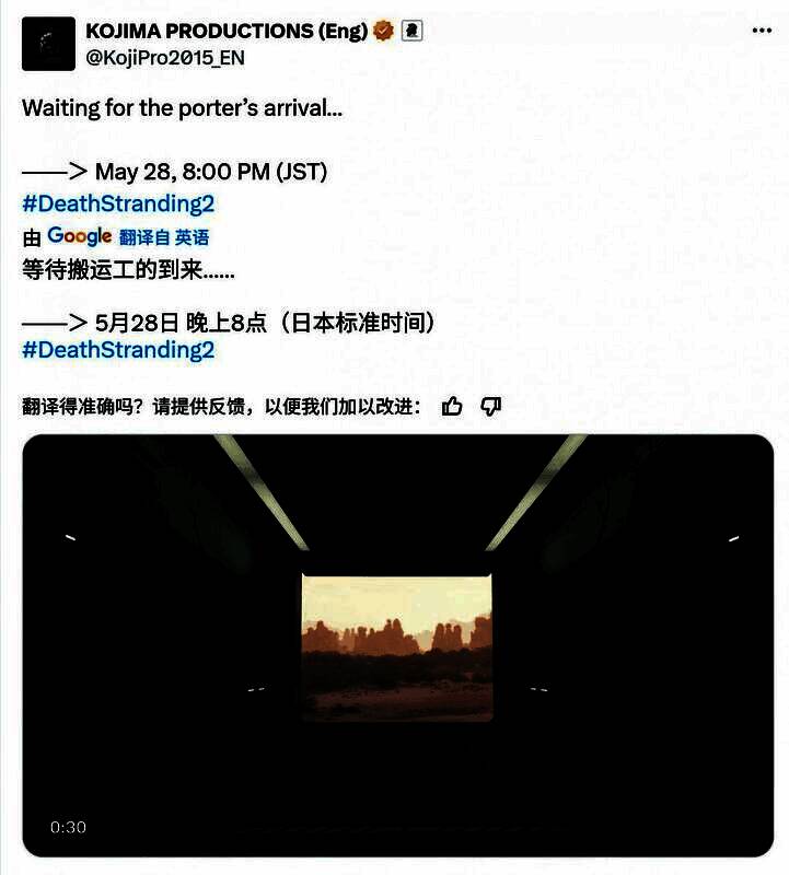 《死亡搁浅2》即将于6月26日发售,登陆PS5平台。小岛工作室官推宣布,他们将在北京时间5月28日晚上7点有重大宣布,配文“等待搬运工的到来”,应该是新的预告片。毕竟发售日早已确定。此前,小岛表示《死亡搁浅2》游戏中将出现搬运工Bokka。