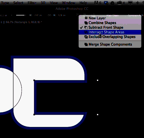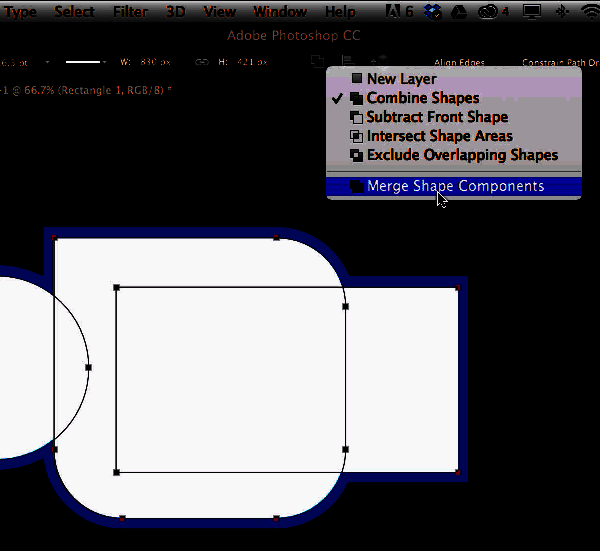 PS另一个很酷的功能是能很容易的实现将矢量图形无损地合并在一起。通常,我们用Command/Ctrl + E来合并位图,但在Photoshop CC版本中,我们可以用同样的快捷键来合并矢量图形图层,而且不用进行栅格化。当两个或两个以上的图形合并在一起之后,还可以通过路径选择工具来进行单个选择,并通过路径操作来改变图形之间相互叠加运算的方式。