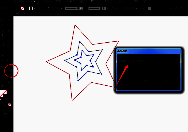 3.接着,鼠标点击选中中间的两个小星形,点击左侧的混合工具,在打开的混合选项中将间距改为平滑颜色