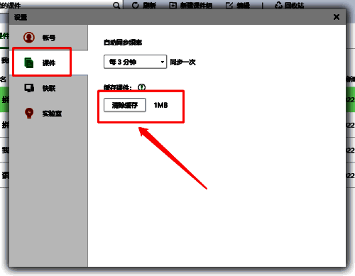 第三步:在课件选项中点击“清除缓存”按钮就可以清除缓存文件了。