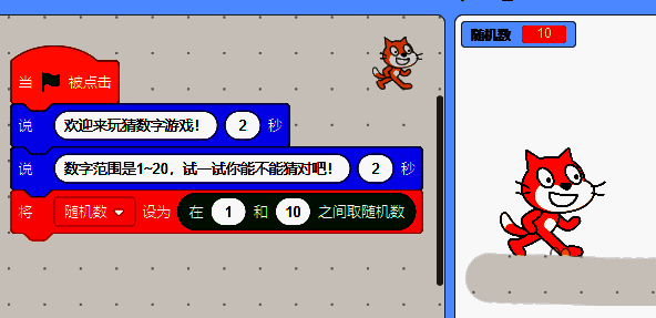 思路:设计数字范围,并且由电脑选取这个范围中的随机数,完成以下程序后,当我们点击绿旗后,就会发现舞台左上角的变量框开始出现1~10之间的随机数啦。