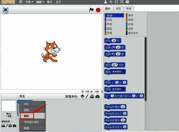 1.首先,在电脑上打开scratch界面后,在左下角的角色栏目中右键点击小猫,选择删除按钮删除小猫