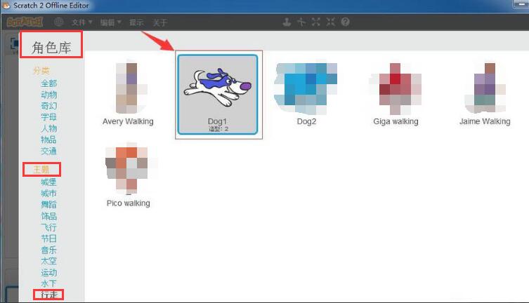 3.最后,在打开的角色库窗口中找到行走主题,点击选中小狗图案进行添加就可以了