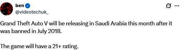 本还称,此次解禁提高了《GTA6》在沙特阿拉伯"不会受阻"地上市的可能性,但《GTA6》的分级也很可能是21岁以上。