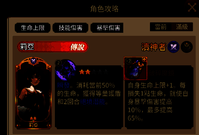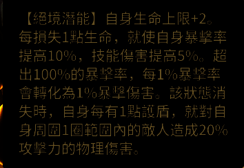 3(现在版本):前半段与2相同,但是另外根据血上限另外加暴击和爆伤,而且还能额外造成伤害。看技能描述数值加成好像是没有上限的,不过限制了buff的回合数。(详见下图)