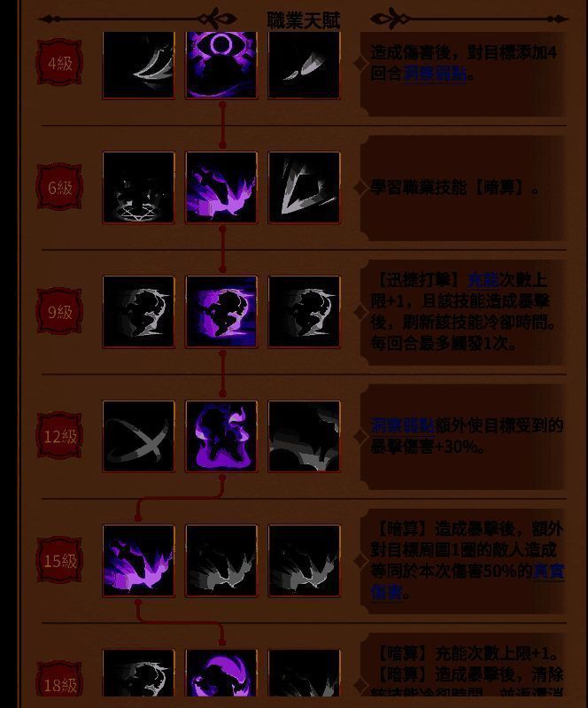 18级天赋:个人推荐2,配合莉亚烧血加暴击的机制,在高生命上限的情况下基本上能稳定白嫖两次“暗算”。【如果有无限行动力,就能一直暗算boss】