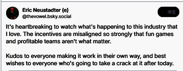 自2023年初至今,微软累计裁员已超2万人。社交平台上,从独立开发者到3A大厂员工纷纷表达对行业持续动荡的痛心。前Xbox Live运营经理、现任The Pokémon Company技术副总裁Eric Neustadter表示:"目睹热爱的行业沦落至此令人心碎,扭曲的激励机制让好游戏和优秀团队变得无足轻重"。BioWare元老、现任《Skate》叙事总监John Epler坦言:"从业18年,这绝对是最黑暗的时刻。”