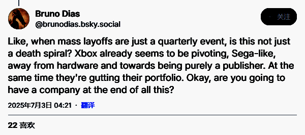 许多从业者认为微软裁员暴露了行业盲目追求无限增长的痼疾。Outerloop Games创意总监Chandana Ekanayak批评道:"为季度财报裁撤数千员工,同时坐拥数百亿利润,这现实太扭曲,永续增长本就是伪命题,简直是对人才资源的巨大浪费。"《Fallen London》前首席叙事设计师Bruno Dias质疑道:"当大规模裁员变成季度例行公事,这难道不是死亡循环?"。他注意到Xbox在缩减硬件业务的同时,正在肢解自己的发行矩阵:"现在的Xbox就像被私募收购后,正在被拆卖铜线的破败公司。"