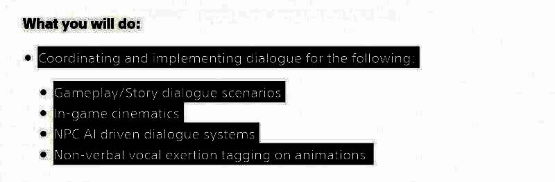 顽皮狗最近在招聘高级对话设计师,其将负责游戏多个部分的对话设计,包括游戏场景与过场动画。该职位还要求设计师负责“NPC AI驱动对话系统”的开发。考虑到顽皮狗过去一直很注重对话设计方面,这一转变颇为耐人寻味。