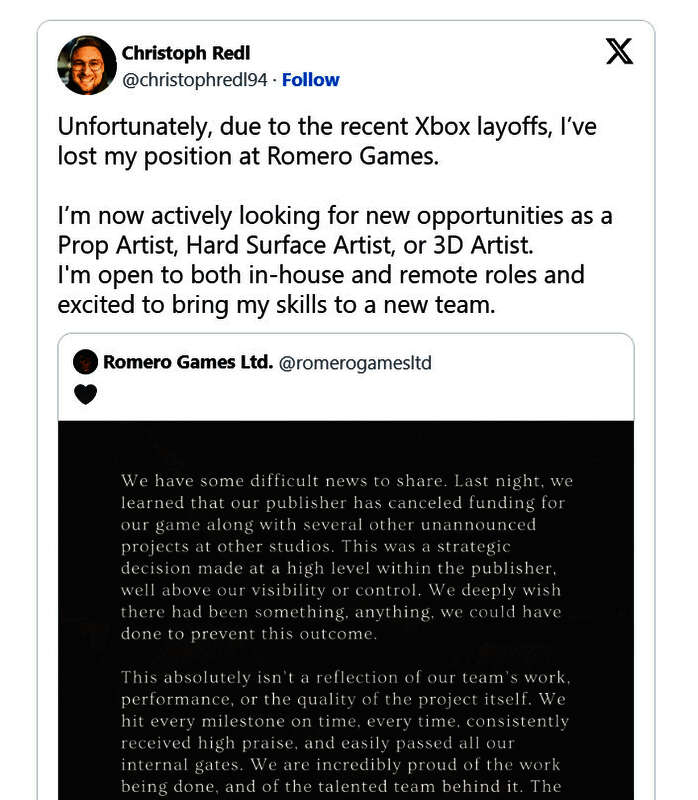 虽然John Romero没有提及这家发行商是谁,但考虑到这件事的巧合之处,明眼人一看就是Xbox。而前员工Christoph Redl也在社交媒体上转发了Romero Games的声明,同时确认该项目被取消就是这一次Xbox大裁员的结果。