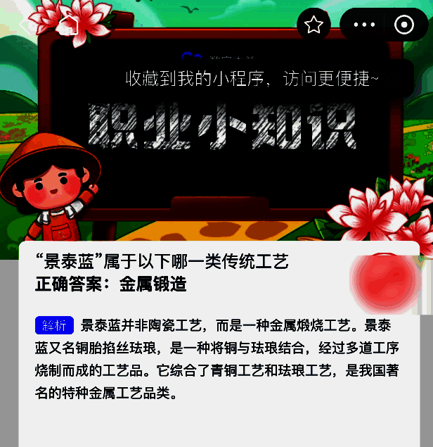 3、答案解析:景泰蓝并非陶瓷工艺,而是一种金属煅烧工艺。景泰蓝又名铜胎掐丝珐琅,是一种将铜与珐琅结合,经过多道工序烧制而成的工艺品。它综合了青铜工艺和珐琅工艺,是我国著名的特种金属工艺品类。