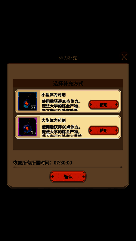 2、体力值在前面一直都没有提到,体力是用在试炼上反复扫荡获取资源的!注意这也是我们获得纹章的一个重要方式。几乎每天都会刷新一次体力,反正有体力就用在试炼里面的快速战斗就对了,不要跟我一样,一直把体力剂囤着也不知道干嘛的,结果就是打不过试炼,打主线的时候也特别吃力。消耗体力值是我们获取资源的重要来源之一,不用省着花,活动任务也会送很多体力药剂。
