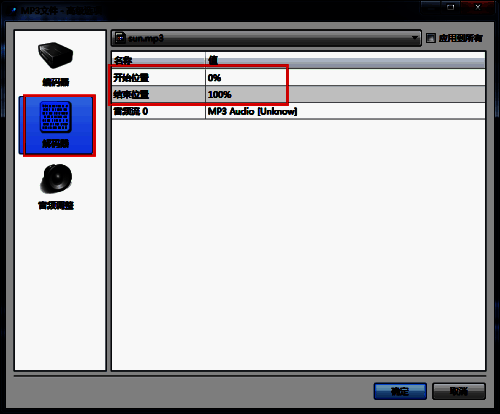4、在“高级选项”界面的左侧打开“解码器”,之后在右侧就可以看到剪辑功能了,我们只需通过调整“开始位置”以及“结束位置”来划出想要剪辑的区域,设置完毕后点击确定;