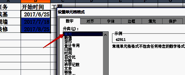 2、选开始时间列日期区域,右键设单元格格式,数字选项卡改日期为常规。