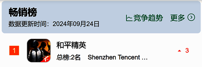 据AppStore榜单显示,凭借“地铁逃生”,《和平精英》在9月24日再度冲上游戏畅销榜首位,三方平台预估日新增下载量超过12万。