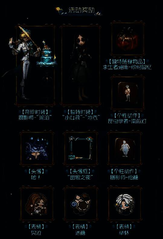在主题活动海报中,【稀世时装】昆虫学者-“鬼烛”示意轻声,【奇珍时装】摄影师-“琥珀”正在万圣之夜为众人献上甜美的糖果,【独特时装】“小女孩”-“地衣”则手举蜡烛,为“捣蛋计划”做着准备。今夜,开始狂欢吧!