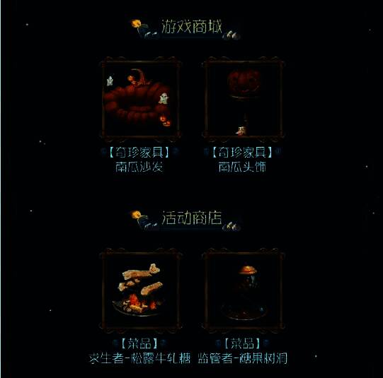 除了全新的活动奖励,游戏商城上新家具——【奇珍家具】南瓜沙发、【奇珍家具】南瓜头饰,活动商店上新菜品——【菜品】求生者-松露牛轧糖、【菜品】监管者-糖果树洞,期待访客们的采购!