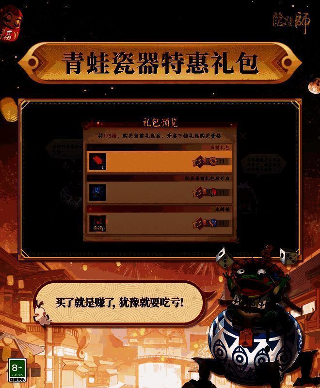 ※青蛙瓷器和茨木呱各带来了三款礼包,每购买一款礼包即可解锁下一款,阴阳师可点击礼包预览查看全部礼包~