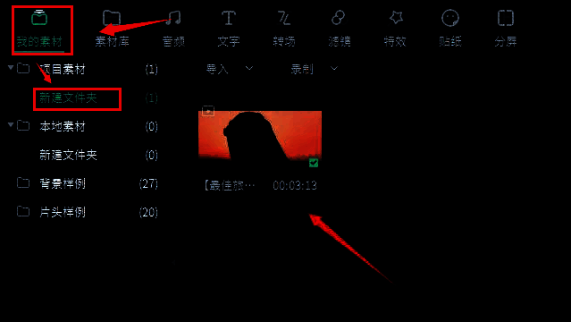 1.首先,打开万兴喵影软件界面后,找到左上角的我的素材菜单,在新建文件夹栏目中导入素材文件