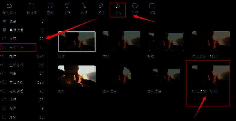 2.点击特效菜单,选择高级工具选项中的线性虚化(移轴)效果