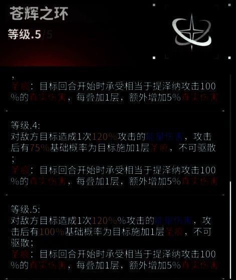 她的“苍辉之环”技能,能够对敌人造成可观的能量伤害,同时还有机会在攻击后为敌人叠加上几层圣痕,并且这些圣痕无法被驱散。这一点让她在与敌人的长期消耗战中,显得极为强势。圣痕效果本身就能让敌人在回合开始时承受真实伤害,而每增加一层圣痕,敌人所承受的真实伤害就会增加,简直是敌人的噩梦。
