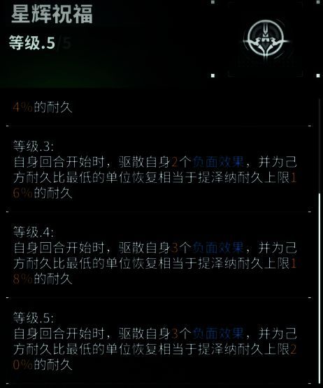 提泽纳的“星辉祝福”技能可以在她的回合开始时,驱散自己身上的负面状态,同时还能够为全队耐久最低的队友回复一定量的耐久。这个技能非常有用,尤其是在面对持久战时,能有效缓解团队的耐久压力,提升整体的战斗持久力。